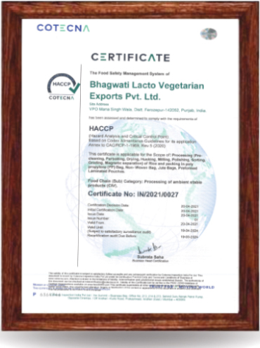 - Accessed and confirmed to meet the requirement of HACCP for the scope of activities of Rice Exporter and Manufacturer